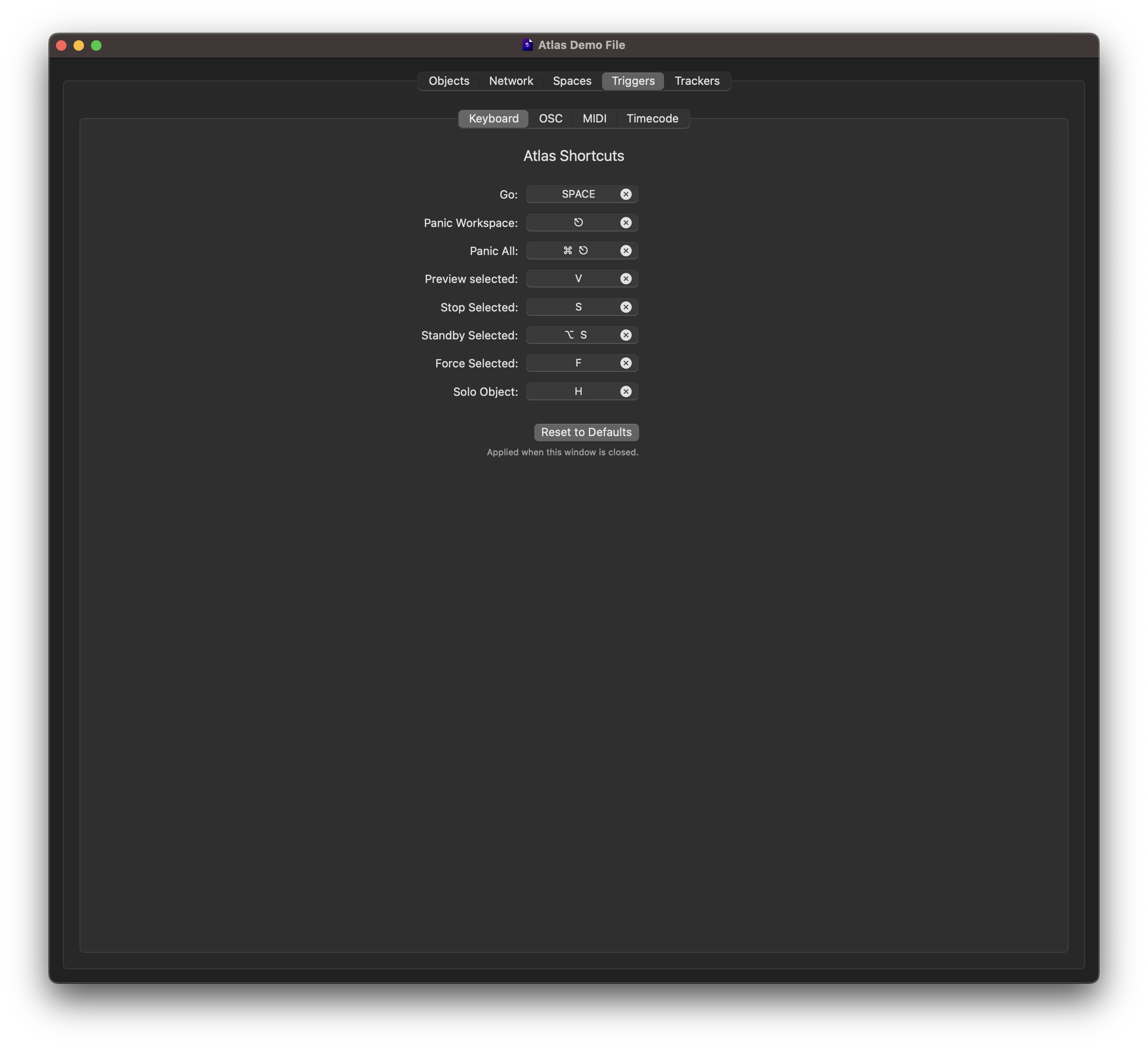 <figure><img src="https://4121747729-files.gitbook.io/~/files/v0/b/gitbook-x-prod.appspot.com/o/spaces%2FmSmRU0BtlSOhG2HtpJOR%2Fuploads%2FHdctuXlh7quhUE7YxrHM%2FShow%20Settings%20-%20Triggers%20-%20Keyboard.png?alt=media&#x26;token=19579cb2-1b78-45c5-bf42-8016961082fb" alt=""><figcaption><p>Show Settings - Triggers showing default keyboard assignments</p></figcaption></figure>