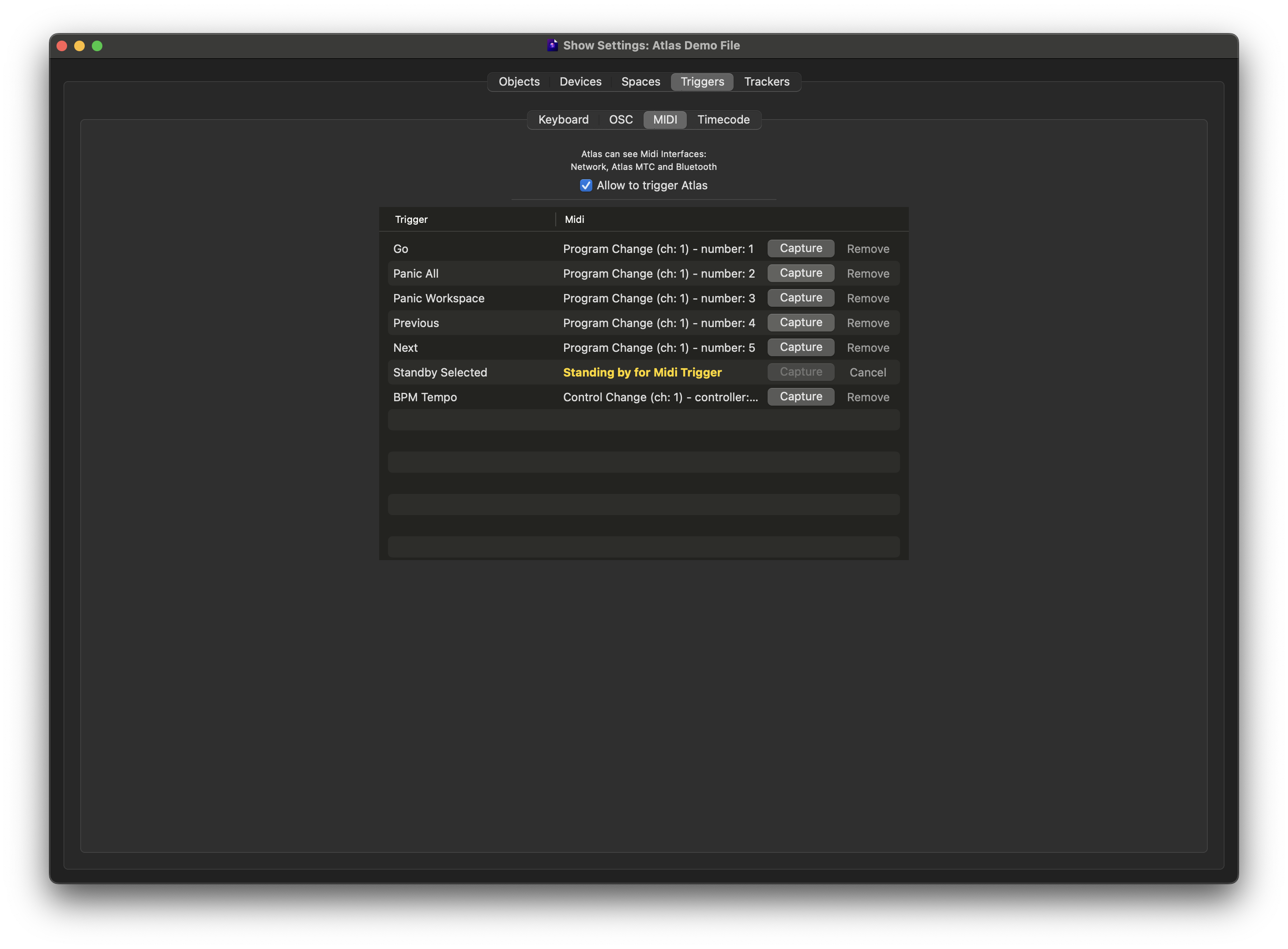 Selecting "Capture" will place Atlas in a listening state. The next incoming midi command received by the computer will be assigned to the trigger.&#x20;